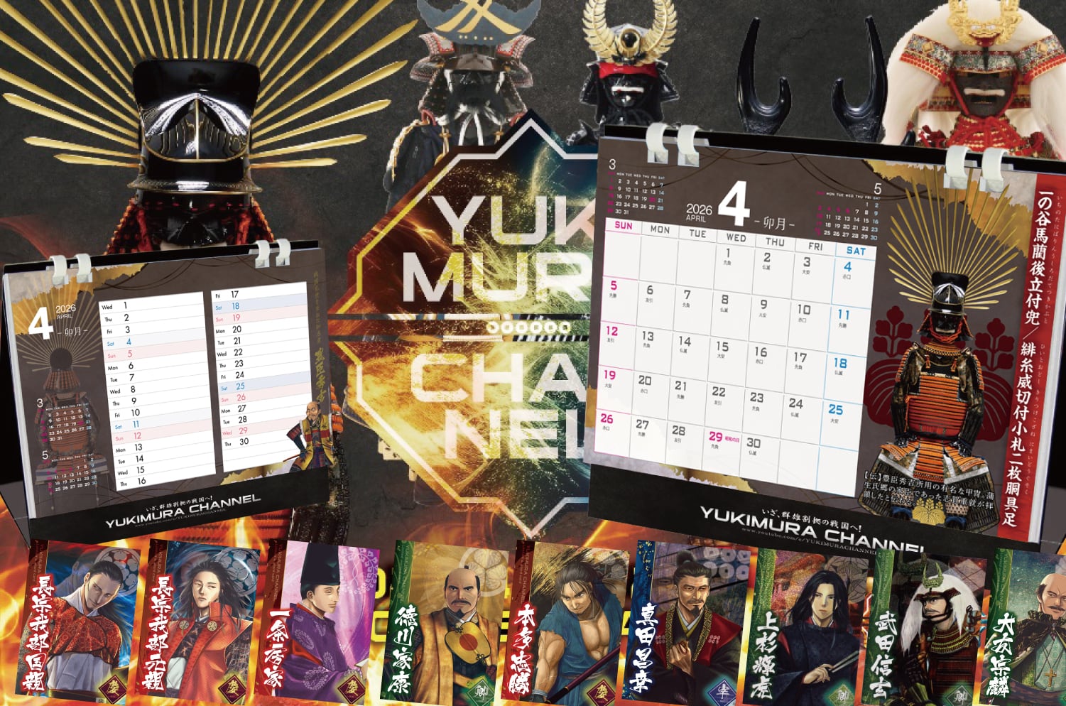 【予約販売商品となります。発送は3月下旬頃を予定しております。】 YUKIMURA自らデザインしたB6サイズのチャンネル特製カレンダー 今年は甲冑工房丸武様 全面協力のもと、有名戦国武将所有と伝わる12種の甲冑(レプリカ)写真を贅沢に配置するカレンダーとなっております。 【YUKIMURA CHANNEL特製 2026年度版 卓上カレンダー】 ・B6サイズ W180 X H160 X D30 mm(組立時) ・カレンダー:両面カラー 全13枚 エコリング加工 ▼セット内容 ・2026年度カレンダー ・コレクションカード 10枚 W63 x H89mm ※カードはランダムとなります(キラキラカード確定) <一覧ページ> https://yukimura.theshop.jp/p/00003 ※5,000円以上で送料無料 ※甲冑写真提供:甲冑工房丸武 ※武将イラスト提供:史環